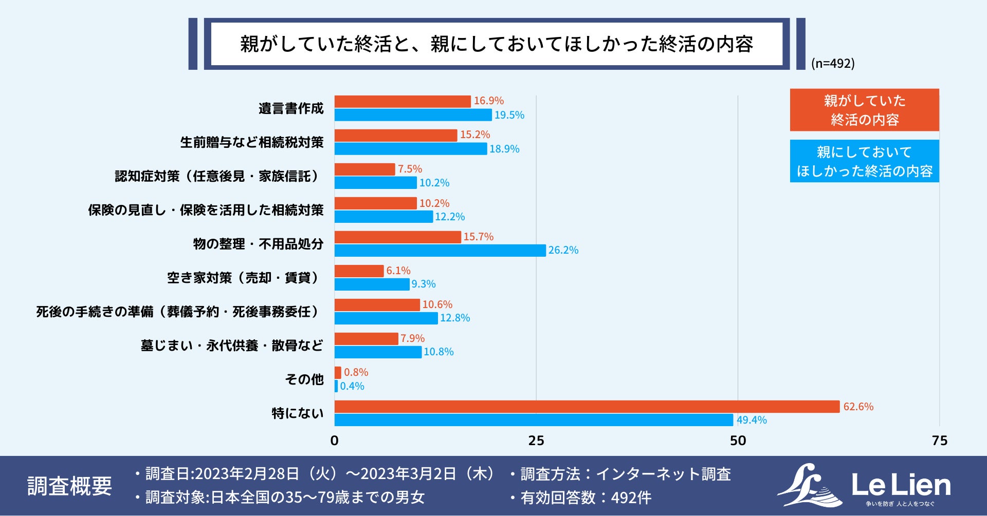 「特にない」を除き、「親が生前に行っていた終活」は「遺言書作成」(16.9%)が最も高い結果となり、子の目から見た「親にしておいてほしかったと思う終活」では「物の整理・不用品処分」(26.2%)が最も高い結果となっています。