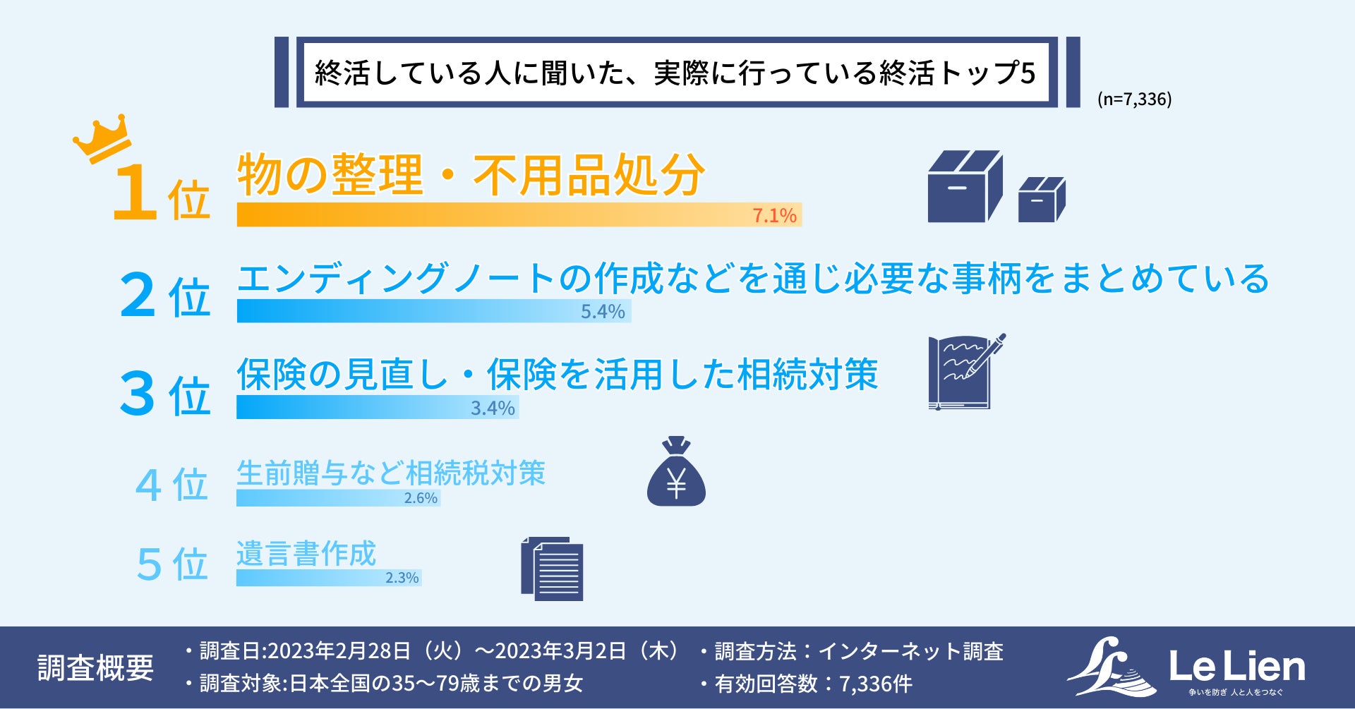 終活を行っている人が実際にどのような内容について準備しているかを調査したところ(複数回答)、「物の整理・不用品処分」(7.1%)、「エンディングノートの作成などを通じ必要な事柄をまとめている」(5.4%)の“物”や“事”の整理がトップ2となり、その後に「保険の見直し・保険を活用した相続対策」(3.4%)、「生前贈与など相続税対策」(2.6%)、「遺言書作成」(2.3%)と、