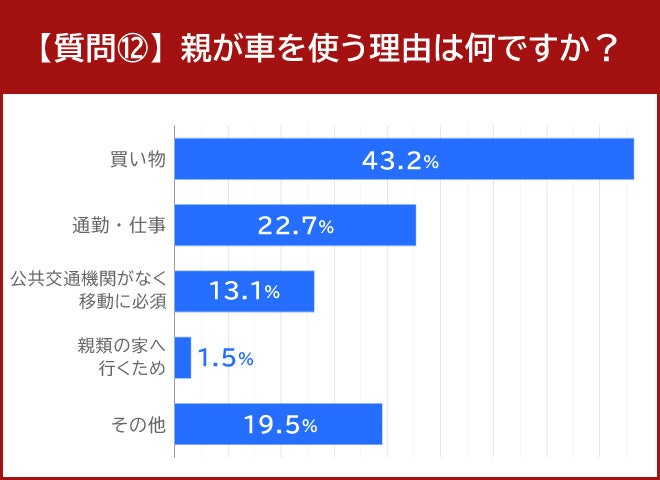 「親が車を使う理由を記載してください」という質問には、「買い物」と答えた人が43.2%でトップでした。