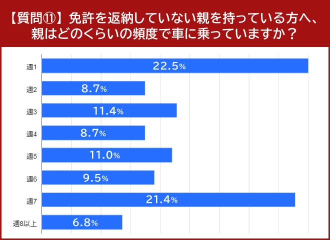 • 親が車に乗る頻度は「週1」が22.5%、「週7」が21.4%でほぼ並ぶ