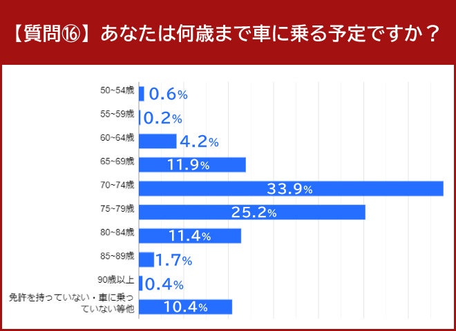 「あなたは何歳まで車に乗る予定ですか?」という質問には、33.9%にあたる160人の人が「70〜74歳」と回答して最多でした。
