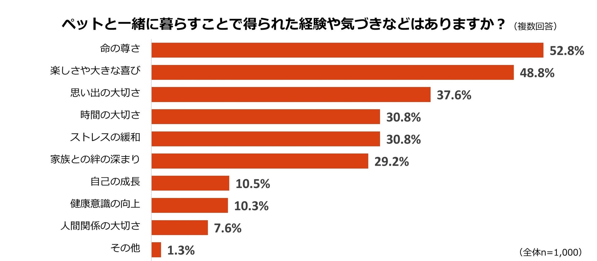 また、ペットと一緒に暮らすことで得られた経験や気づきとして「命の尊さ」「楽しさや大きな喜び」を知ったと答えている方が約半数(複数回答)となりました。家族の一員である大切なペットを亡くす悲しみはとても大きいものですが、ペットと過ごす時間の中で得られる学びや喜びも大きいものであることが伺えます。