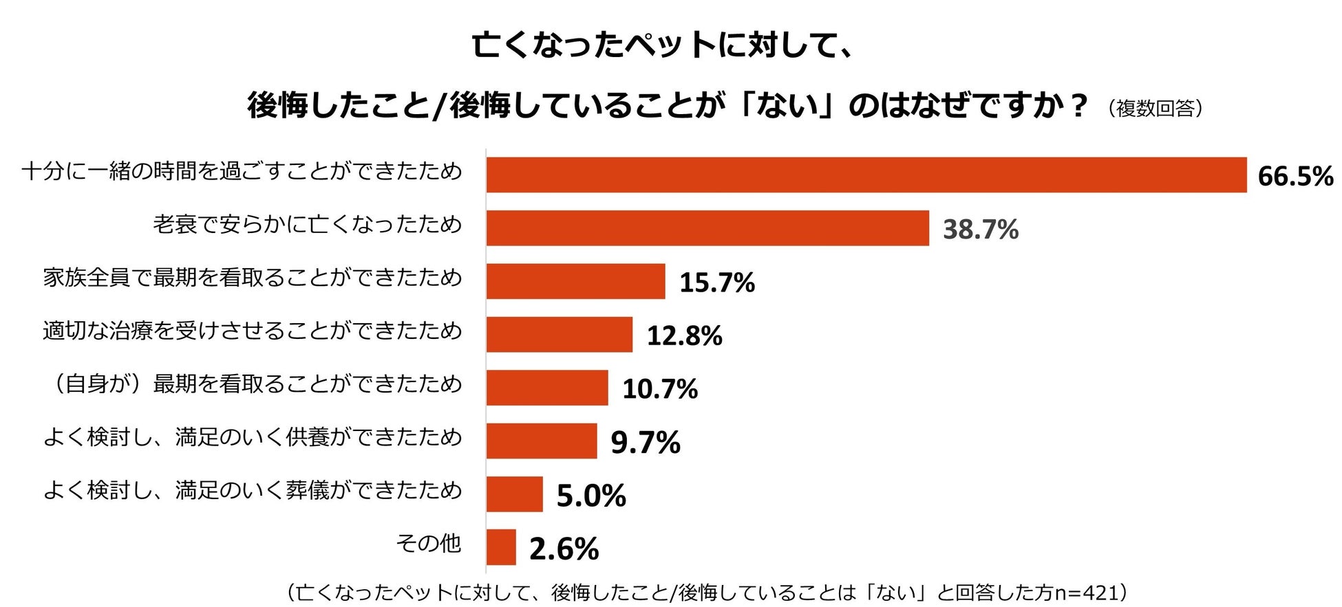 一方で「後悔していることがない」を選択した方に、その理由を尋ねたところ、「十分に一緒の時間を過ごすことができたため」(66.5%)が最多で、後悔なくペットを看取るためには一緒に過ごす時間が重要であるようです。次いで「老衰で安らかに亡くなったため」(38.7%)が選ばれ、病気やケガと異なり、天寿を全うしたと受け止めることができたのかもしれません。