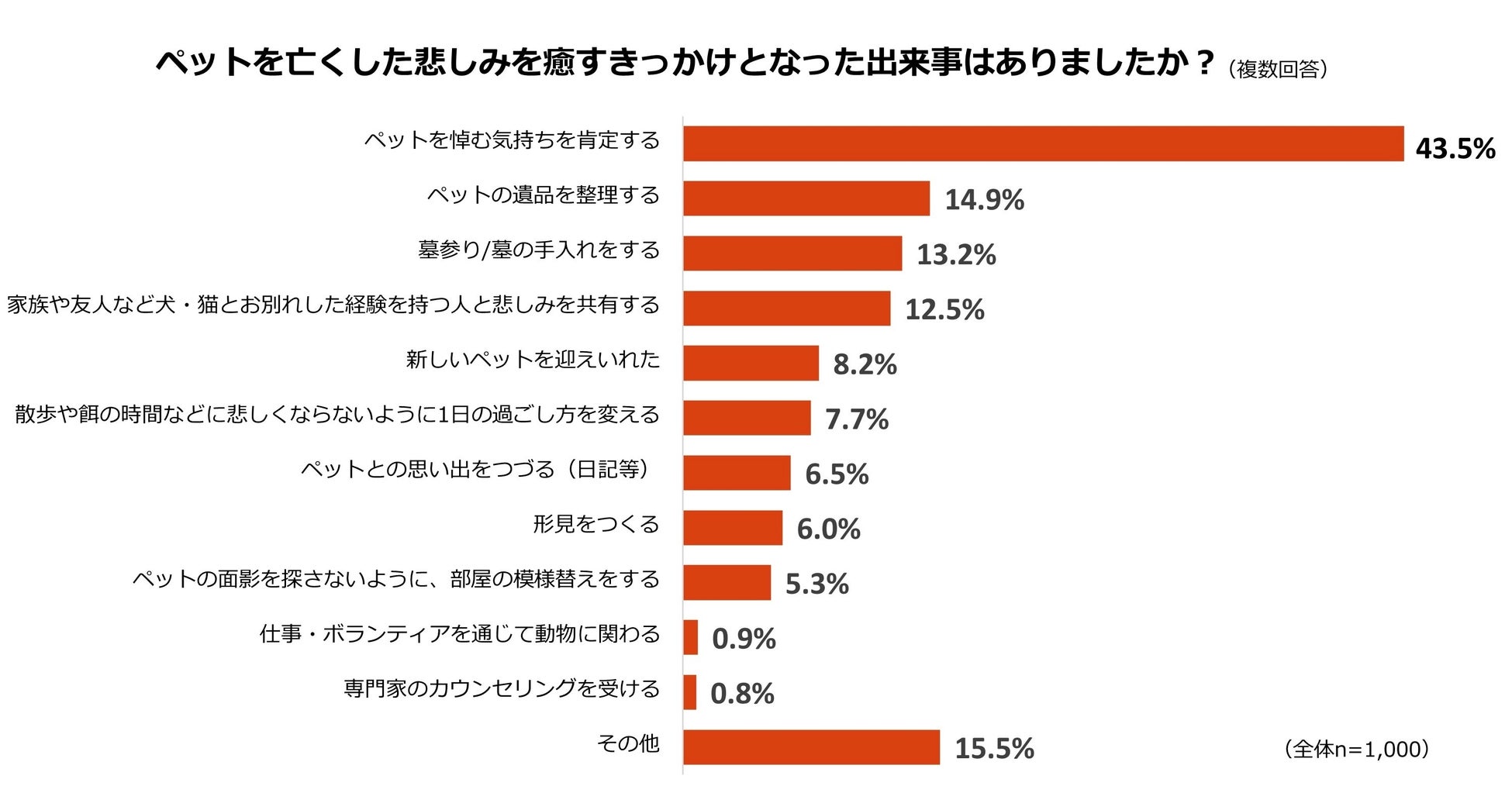 ペットを亡くした悲しみを癒すきっかけとなった出来事として、43.5%(複数回答)が「ペットを悼む気持ちを肯定する」を選択しており、ペットの死を悼み、悲しみを肯定することで乗り越えようとされる方が多いようです。